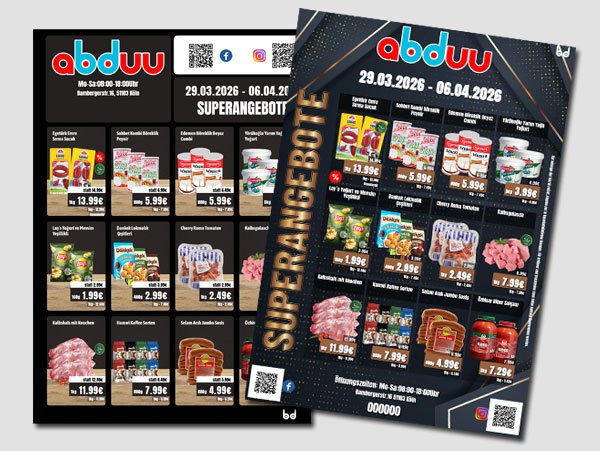 Wir präsentieren stolz abduu.com – Ihre Antwort auf ein modernes, effizientes und zeitsparendes Werkzeug, um Ihre Angebots-Flyer zu erstellen und digital zu teilen. Schluss mit dem mühsamen Prozess des manuellen Flyer-Designs und der lästigen Verwaltung Ihrer Angebote. Mit abduu.com wird das Erstellen, Teilen und Präsentieren von Wochenangeboten, Tagesangeboten und mehr so einfach wie nie zuvor!